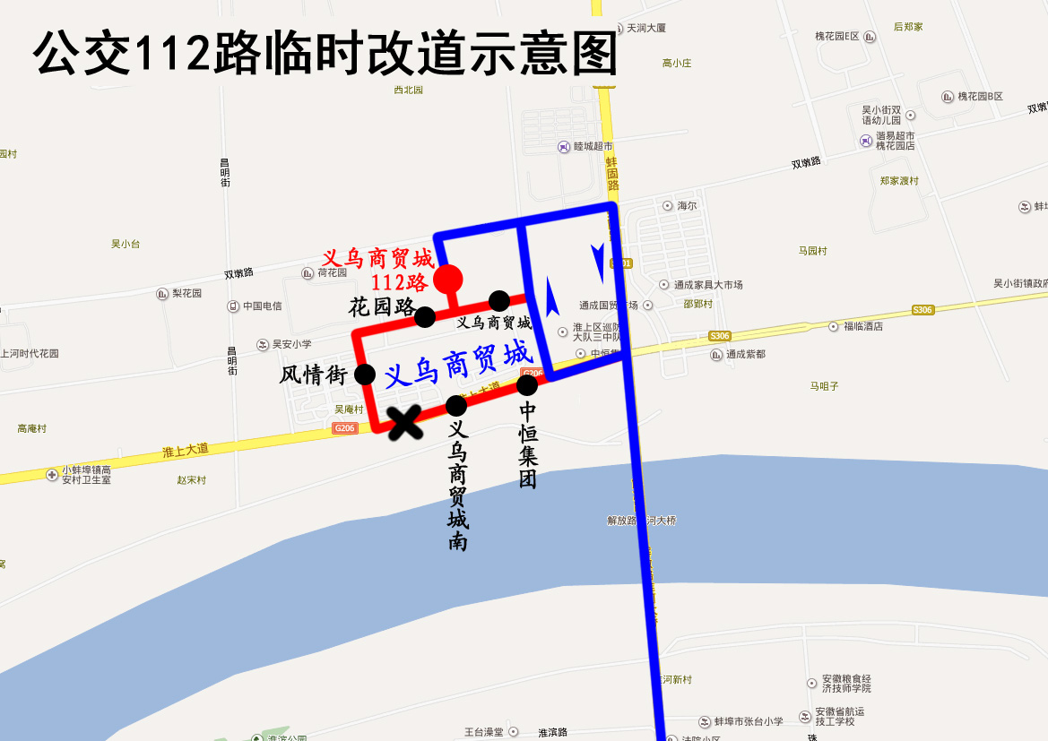 112路公交車臨時改道公告 因花園路(永平街至昌平街)封閉施工,2019年4月18日起,公交112路大慶路首末站至義烏商貿城方向改道為:原線路—淮上大道—昌平街—雙墩路—義烏商貿城。義烏商貿城至大慶路首末站方向保持不變。 改道期間公交車將取消停靠“中恒集團”、“義烏商貿城(南)”、“風情街”、“花園路”、“義烏商貿城(花園路上客站)”站。封閉施工結束后恢復原線。