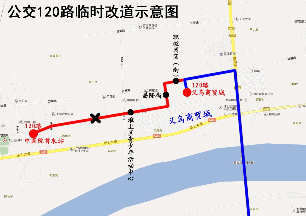 120路公交車臨時改道公告 因花園路(永平街至昌平街)封閉施工,2019年4月18日起,公交120路由原中醫院首末站調整至義烏商貿城首末站。 改道期間公交車將取消停靠“中醫院首末站”、“淮上區青少年活動中心”、“昌隆街”、“職教園區(南)”站。封閉施工結束后恢復原線。