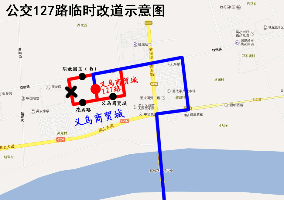 因花園路(永平街至昌平街)封閉施工,2019年4月18日起,公交127路來回雙向改道為:原線路—雙墩路—馬園路—原線路。高鐵南站至義烏商貿城方向保持不變。
