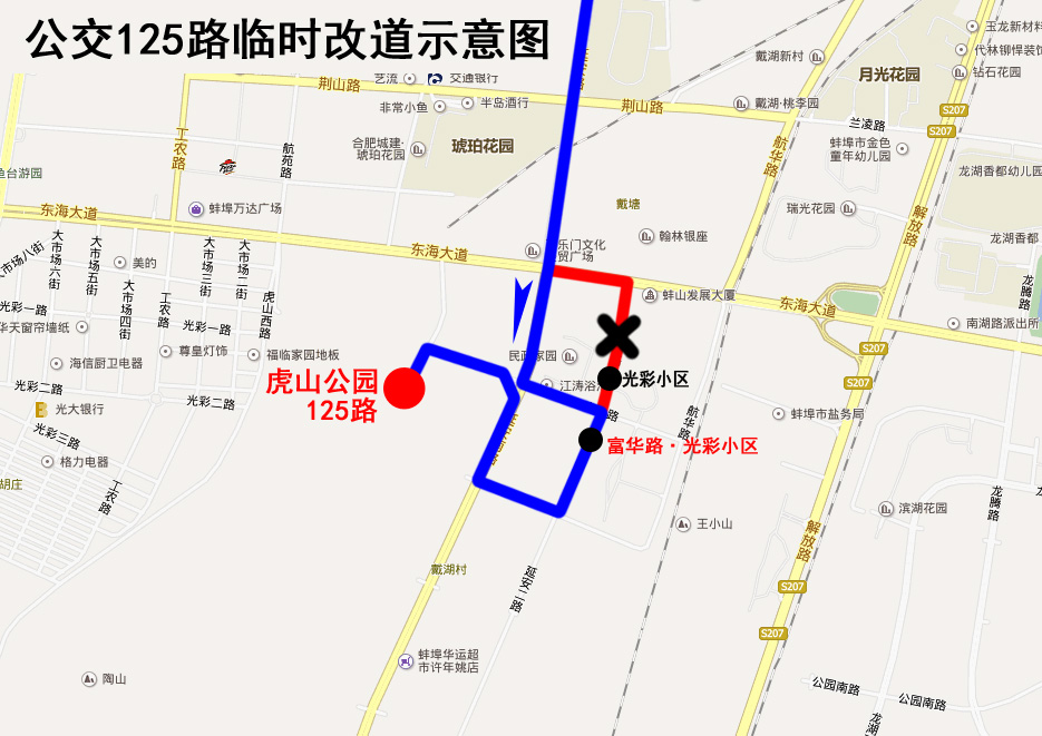 因航華路(東海大道至康民路);富華路(東海大道至富民路)封閉施工,2019年4月17日起,公交125路大慶路橋首末站至虎山公園改道為:原線路—延安路—富民路—富華路—康明街—延安路—富民路—虎山公園首末站。虎山公園至大慶路橋首末站方向保持不變。