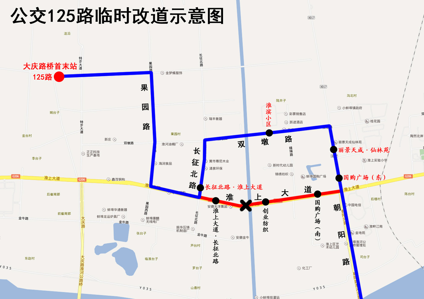 因淮上大道(朝陽路—長征北路)路段路面破損嚴重,已無法滿足公交車通行條件。2019年4月25日起,公交125路來回雙向改道為:原線路—淮上大道—果園路—原線路調整為原線路—朝陽路—雙墩路—長征北路—淮上大道—果園路—原線路。