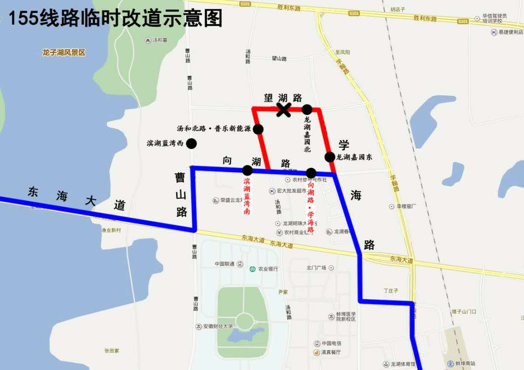因湯和路與望湖路交叉口封閉施工,自5月2日起,公交155路來(lái)回雙向改道為:原線路—東海大道—曹山路—向湖路—學(xué)海路—原線路。