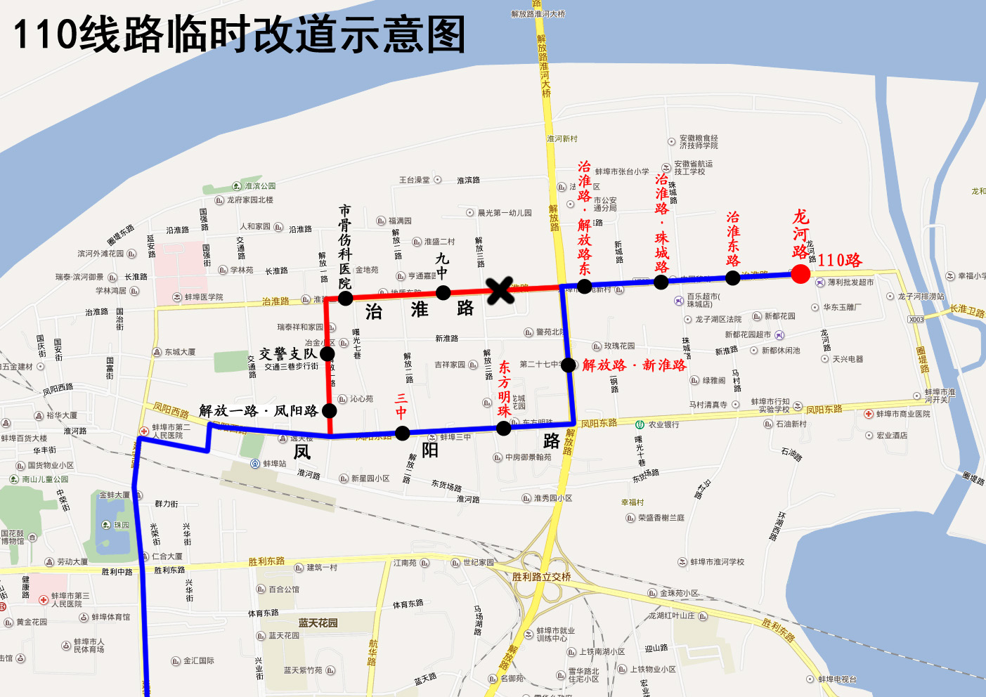 因治淮東路(解放路至東圈堤)道路施工完畢,公交110路由肉聯廠臨時首末站恢復至龍河路發車運營。同時恢復停靠“治淮路•解放路(東)”、“治淮路•珠城路”、“治淮東路”、“龍河路”站。“鳳陽路•解放路”、“鳳陽路•珠城路”、“肉聯廠”臨時停靠站將不再停靠公交110路。