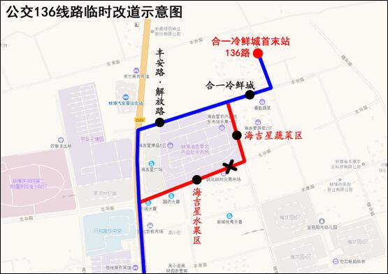 因盛世路道路擁堵、龍華路部分道路損壞嚴重,自2020年4月3日起,公交136路部分走向由:“合一冷鮮城首末站—豐安路—盛世路—龍華路—解放路—原線路”調整為“合一冷鮮城首末站—豐安路—解放路—原線路”。