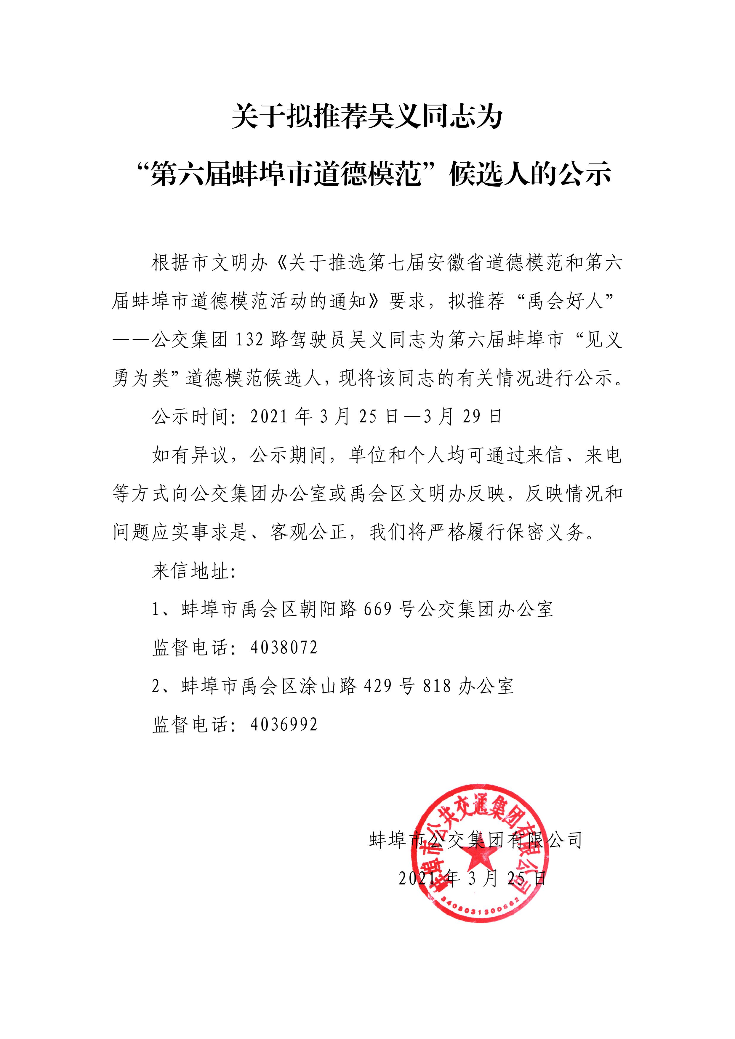關于擬推薦吳義同志為“第六屆蚌埠市道德模范”候選人的公示