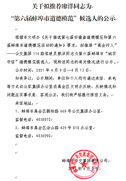關于擬推薦廖洋同志為“第六屆蚌埠市道德模范”候選人的公示